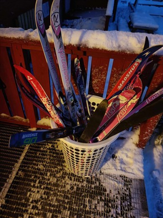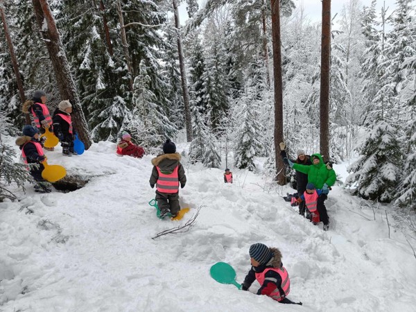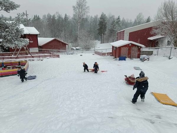 Alle kan ha med ski og gå på ski på barnehagens uteområde. Vi har også en veldig fin akebakke som vi bruker mye og vi har vært på aketur i skogen!